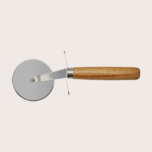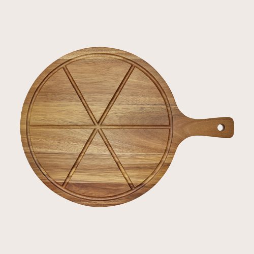 Set de pizza fabricado en madera de acacia. El set incluye una tabla para servir pizza con 6 ranuras para cortar y hacer porciones iguales, y un cortador de pizza.