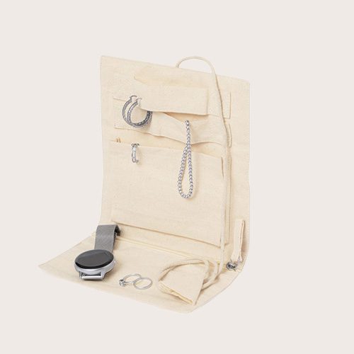Joyero plegable fabricado en algodón, para guardar preciados artículos personales. Confeccionado en 3 partes de color natural: parte superior con cintas, parte central con bolsillo y parte inferior con bolsillo de cremallera, pudiendo plegarlo y sujetarlo firmemente con su cordón a juego.