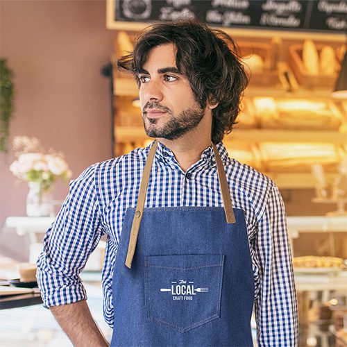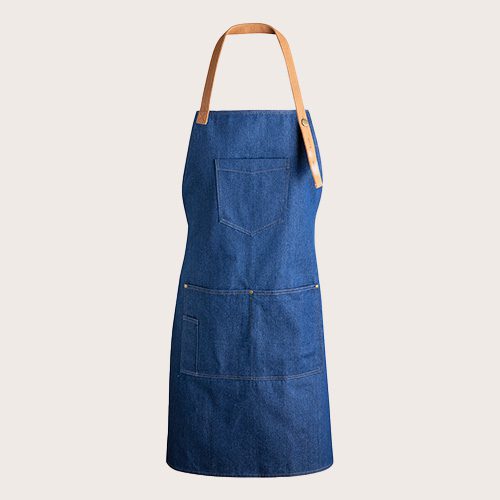 Delantal de alta calidad en resistente tela de acabado denim. De corte por debajo de la rodilla, con cinta de cuello ajustable por botón, cintas para la cintura en color marrón, reforzadas. Incluye multitud de bolsillos para llevar cómodamente los distintos utensilios, con costuras reforzadas y remaches metálicos.