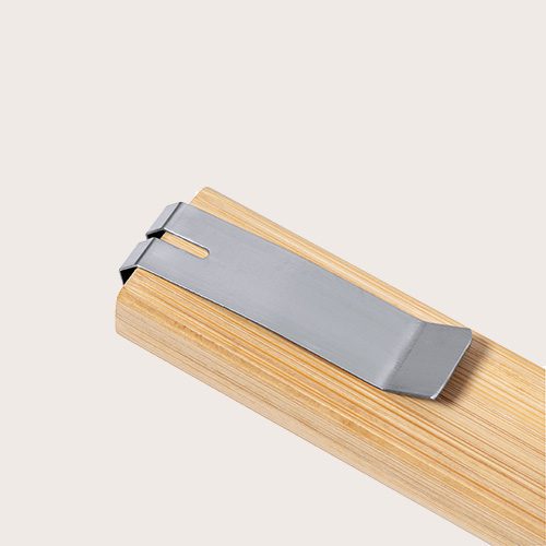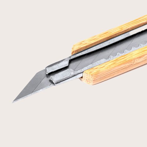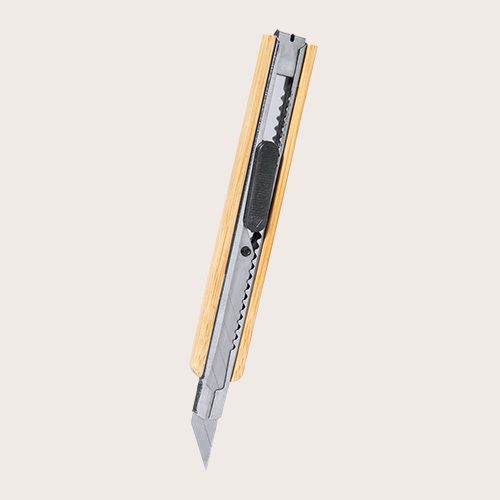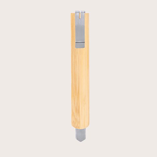 Cutter metálico con carcasa fabricada en bambú. Con mango ergonómico troquelado y clip extraíble con ranura para corte de cuchillas.