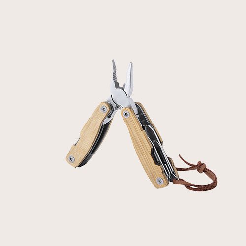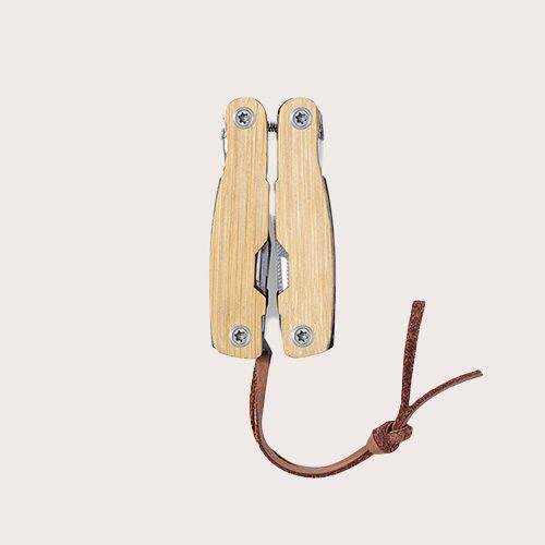 Multiherramienta con resistente cuerpo en acero inoxidable y empuñadura de bambú, con 12 funciones. Incluye cuchillos y navajas destornilladores, limas abridores y alicates. Con cinta para transporte en polipiel y presentada en caja individual.
