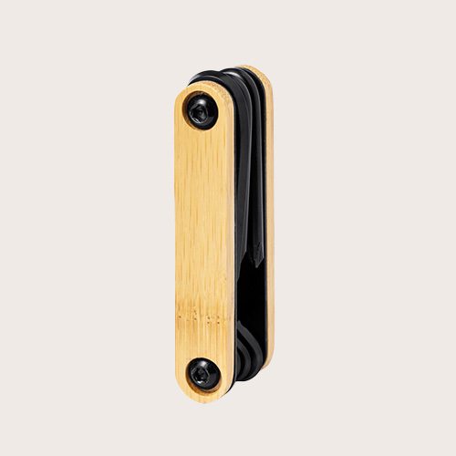 Práctica multiherramienta fabricada en resistente acero al carbono de acabado en color negro, con carcasa de bambú y 7 funciones: llaves allen, destornillador plano y philips. Presentada en caja de diseño kraft.