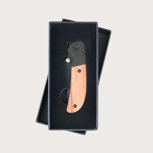 Navaja de una sola utilidad con mango de madera y filo de acero inoxidable de color negro. Presentación en caja de cartón forrado negro.