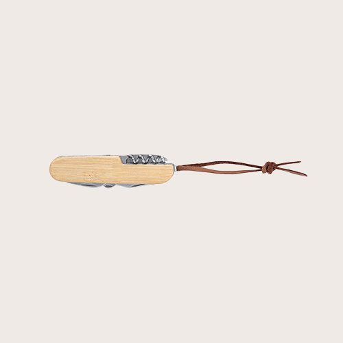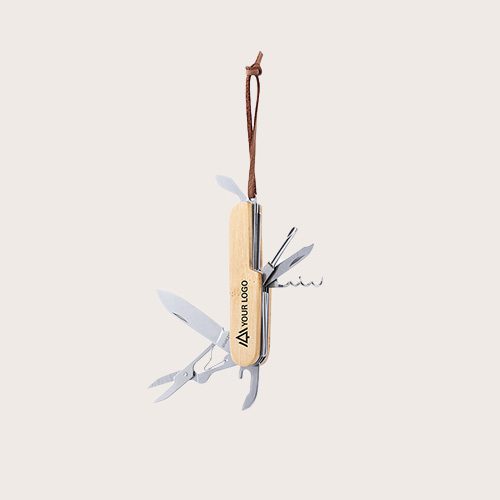 Navaja multiusos, en combinación de materiales bambú y acero inoxidable, con 9 funciones. Incluye navaja, abridores, tijeras, lima, destornillador, sacacorchos. Con cinta para transporte en polipiel y presentada en caja individual.