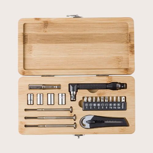 Set de herramientas de acero al carbono de 27 piezas. Incluye: tres destornilladores, diez puntas en su soporte (incluyendo Phillips, planas, Torx y conector), un adaptador, cuatro llaves de tubo, un cúter y un mango.