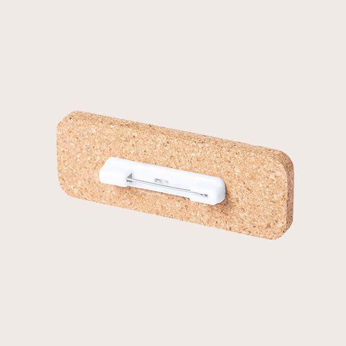 Identificador fabricado en corcho natural, para así fomentar la utilización de materias primas naturales y reducir las emisiones contaminantes. Fijación de seguridad con imperdible en la parte trasera.