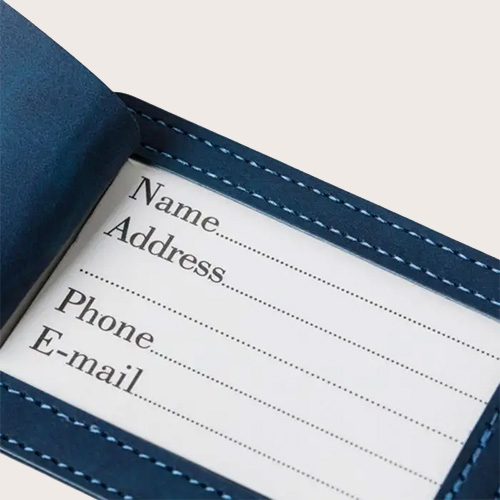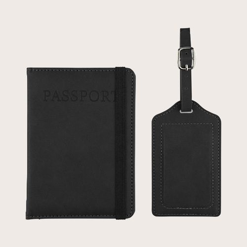 Set de porta pasaporte de PU reciclado y etiqueta de equipaje de PU reciclado presentados juntos en una caja de cartón marrón con ilustración. El porta pasaporte tiene la palabra «passport» impresa en la parte delantera y dos bolsillos interiores para guardarlo de forma segura. Ambos acabados con un logotipo de reciclado en relieve.