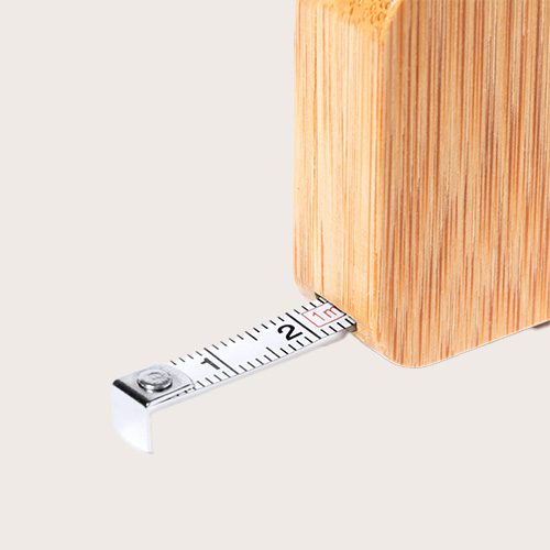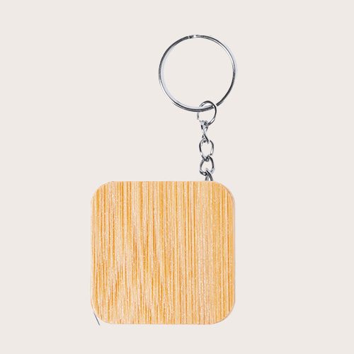 Flexómetro llavero fabricado en bambú. Con cuchilla metálica de 1 metro y medidas en centímetros.