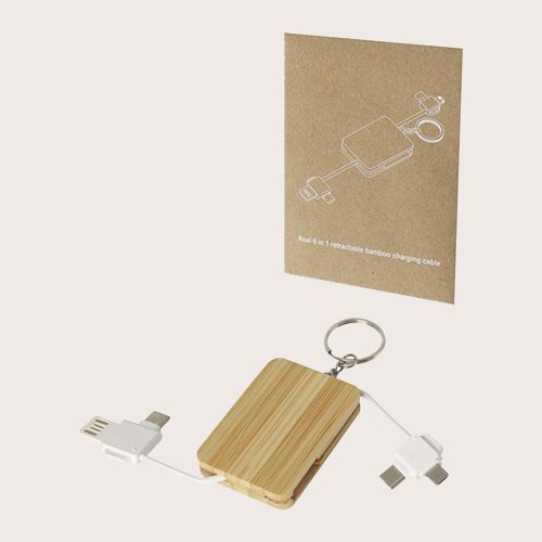 El llavero de bambú con cable de carga 6 en 1 combina sostenibilidad y estilo. Con una longitud de 12 cm, este cable de TPE compacto y retráctil proporciona una potencia de carga de 2 A sin enredos. Los conectores USB de aluminio proporcionan una conexión segura y estable, lo que garantiza una carga constante en todo momento. El llavero de acero inoxidable plateado permite organizar y llevar el cable cómodamente.