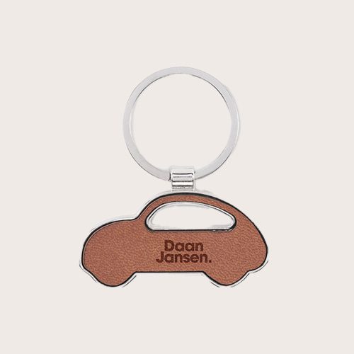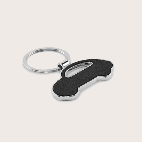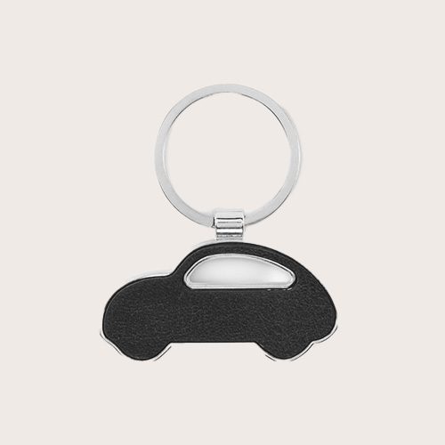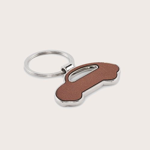 Llavero metálico en forma de coche con incrustación de cuero sintético reciclado.