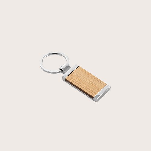 Llavero rectangular de bambú con carcasa de metal. Se suministra con una caja de papel kraft. Como el producto está fabricado con materiales naturales, el color como el resultado de la impresión pueden variar entre unos y otros productos.