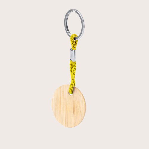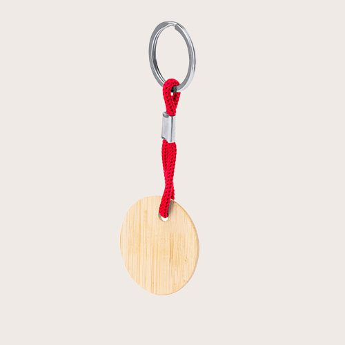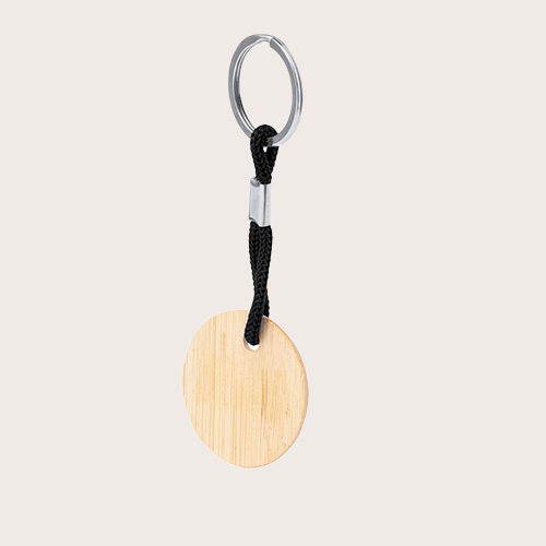 Práctico llavero redondo, fabricado en bambú, con cordón en variados colores. Es ideal para el marcaje en láser.