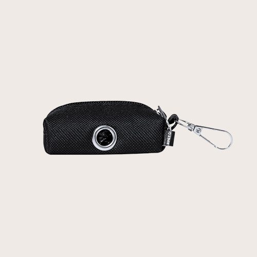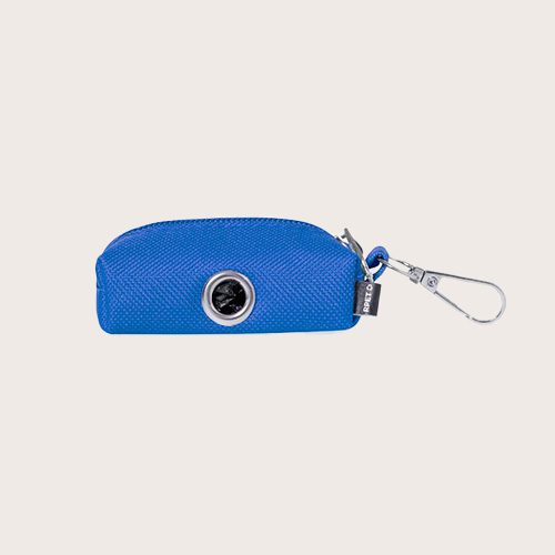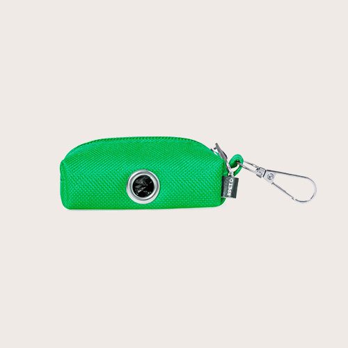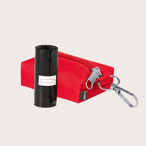 Dispensador de bolsas para mascotas fabricado en RPET. Original diseño en forma de monedero con cremallera y un anillo metálico para poder extraer las bolsas fácilmente. Cómodo transporte gracias a su mosquetón integrado con 15 bolsas biodegradables incluidas.
