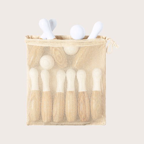 Juego de bolos fabricado principalmente en resistente madera natural de pino, con parte superior de cada bolo lacada en blanco. Set de 9 bolos y 3 bolas de color blanco, en bolsa de transporte algodón, con cordón de cierre a juego.