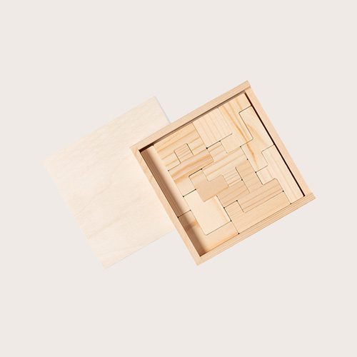 Juego de habilidad fabricado en resistente madera. Con 13 piezas en caja de madera con tapa. Presentación en caja individual de diseño kraft.