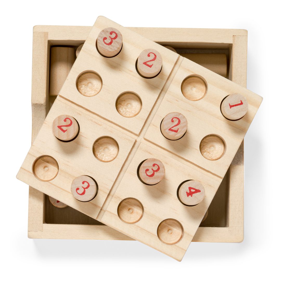 Juego de habilidad sudoku fabricado en suave madera. Incluye 16 fichas de madera numeradas, en estuche de madera con tapa-tablero.