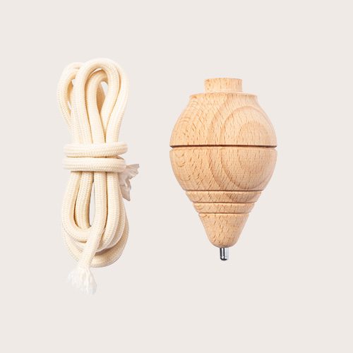 Peonza fabricada en resistente madera maciza, con cuerda en algodón de 120 cm de largo.