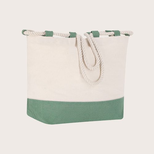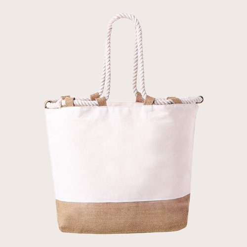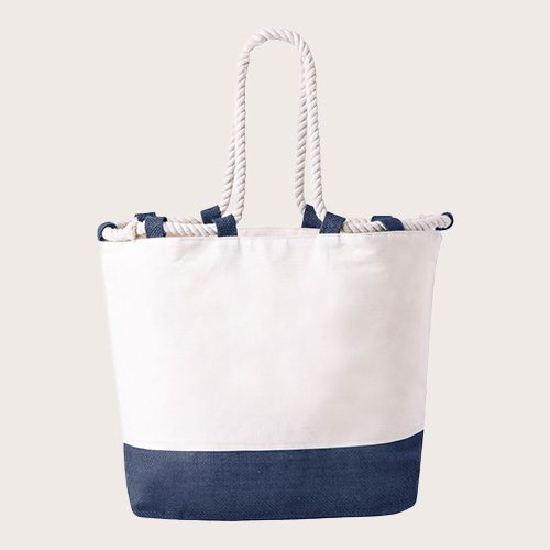 Bolsa fabricada en resistente algodón de 280 g/m². De acabado cosido, con fuelle y asas largas de 50 cm reforzadas, de color blanco en forma de cuerda. Disponible en variada gama de colores bicolor, con resistencia hasta 10 kg de peso.