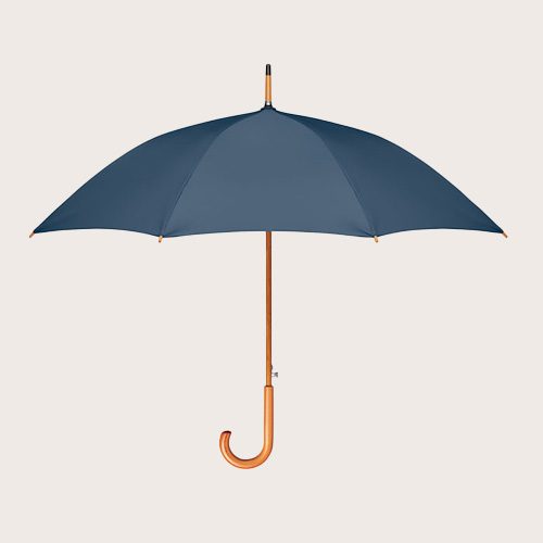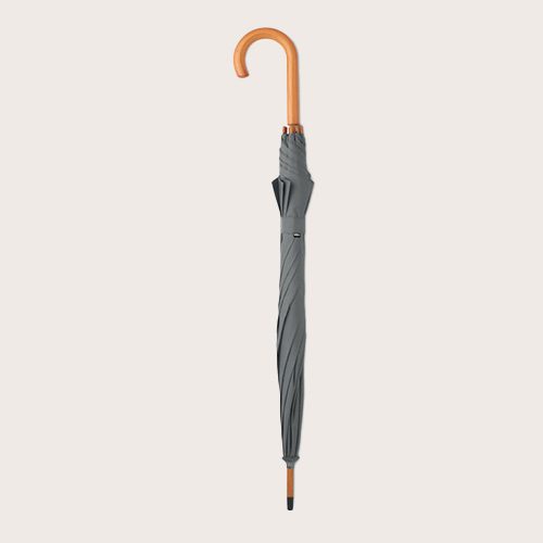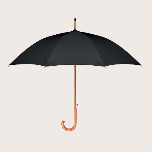 Paraguas apertura automática de 23» de pongee 190T RPET con eje, puntas y parte superior de madera. Varillas en chapado metálico negro. Mango de madera curvado con acabado natural. Cierre manual.