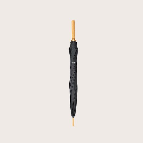 Paraguas de 105cm de diámetro en material pongee 190T RPET. Apertura manual y varillas de fibra de vidrio antiviento, de elegante color negro con cierre de velcro. Mango recto hecho en bambú y etiqueta distintiva RPET.