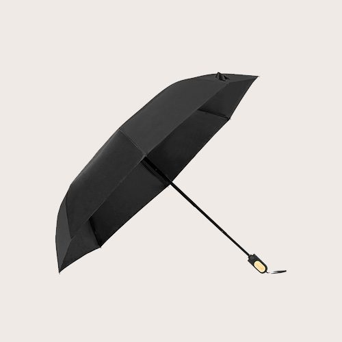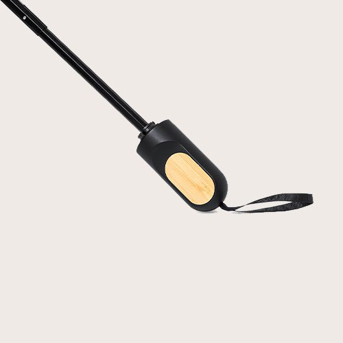 Paraguas plegable de 97cm de diámetro. En material pongee 190T RPET. De apertura manual, con sistema anti viento y varillas fabricadas en fibra de vidrio. Mango ergonómico con elegante detalle en bambú, fácil transporte gracias a su cordón, funda y cierre con velcro a juego. Con etiqueta distintiva RPET.