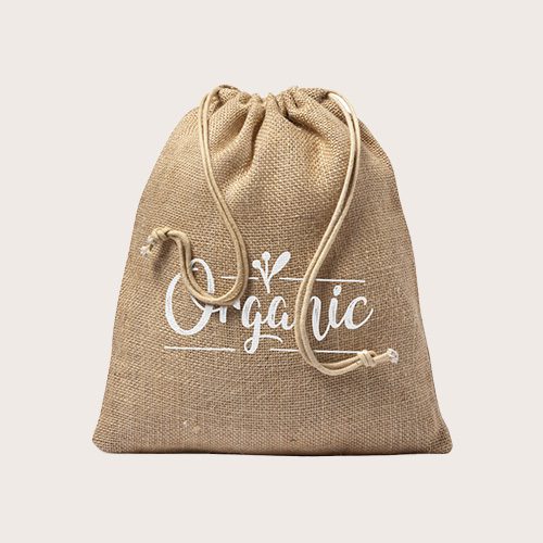 Bolsa fabricada en resistente yute de 260 g/m², con elegante cierre de cordón y acabado cosido.