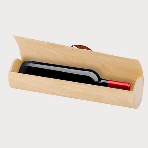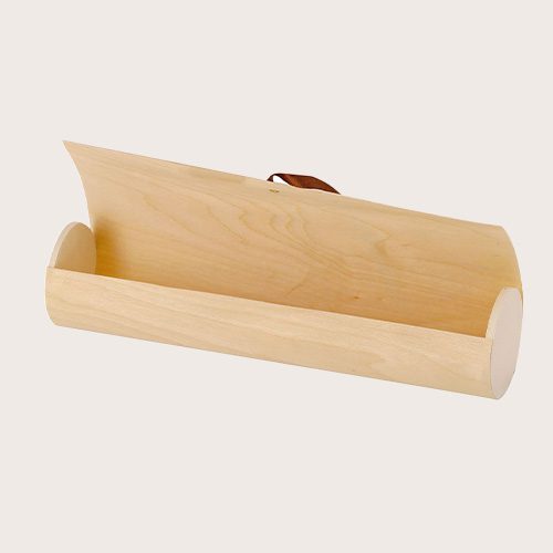 Elegante caja de presentación fabricada en madera. Forma cilíndrica con tapadera de suave madera y cierre de cuerda en polipiel. Presentado en caja de diseño kraft.