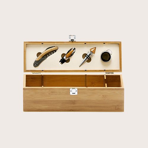 Set de vino suministrado en caja, fabricado en bambú, zinc y acero inoxidable. En su interior incluye un sacacorchos con navaja sommelier, una gargantilla recoge gotas, un dosificador y un tapón.