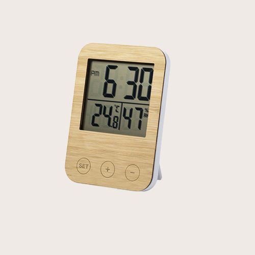 Estación meteorológica con frontal en bambú. Funciones higrómetro y termómetro. Alimentación a pilas (2xAAA no incluidas) y presentado en atractiva caja de diseño eco.
