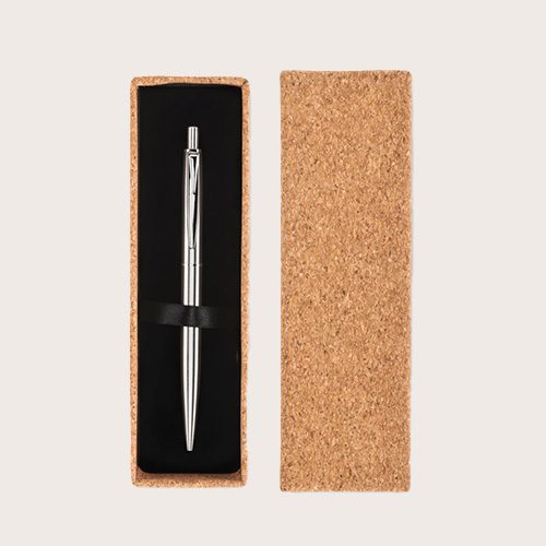 Bolígrafo con pulsador y cuerpo de acero inoxidable reciclado. Presentado en caja de corcho a juego. El corcho es un material natural, debido a su naturaleza estructural y porosidad superficial, el resultado final de la impresión por artículo puede tener desviaciones.