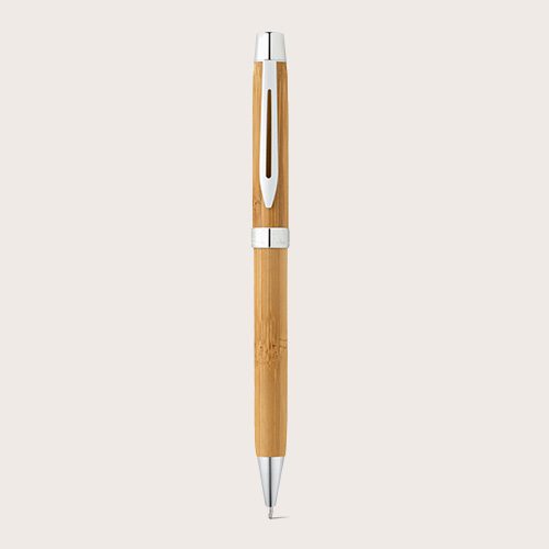 Bolígrafo de bambú con mecanismo giratorio y clip metálico. Tinta azul. Suministrado en estuche de bambú. Como el producto está fabricado con materiales naturales, el color como el resultado de la impresión pueden variar entre unos y otros productos.