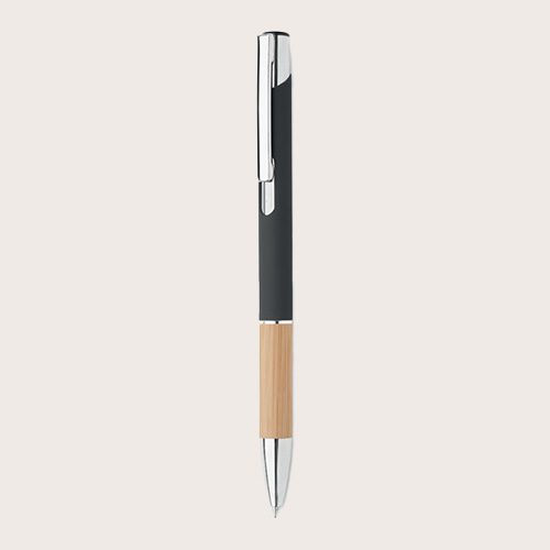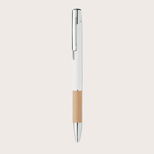 Bolígrafo pulsador de aluminio con empuñadura de bambú.