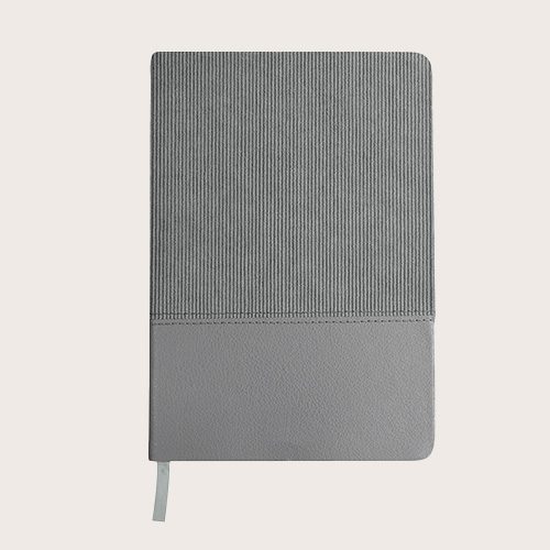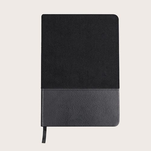 Bloc de notas A5 en suave pana de poliéster y PU Reciclado. Incluye con 80 hojas en color crema, de disposición a una raya y con marcapáginas a juego. Logotipo PU Reciclada en contraportada.