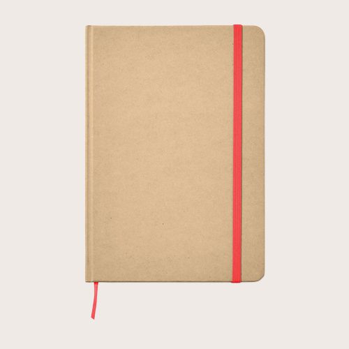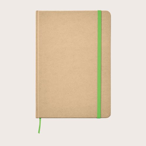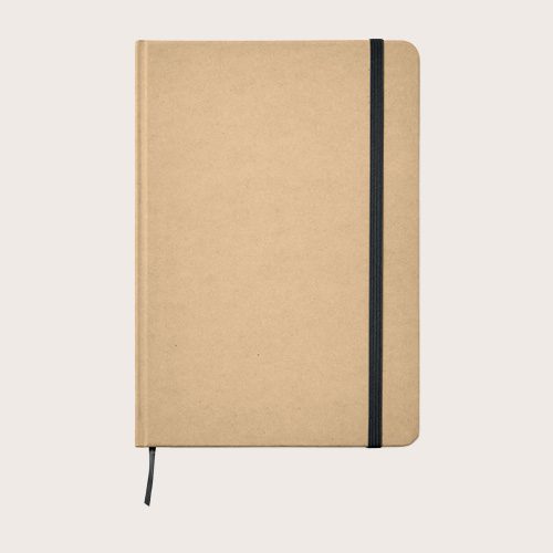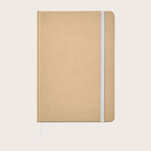 Cuaderno A5 con cubierta de cartón reciclado duro. Encuadernado en cartoné. 160 páginas de papel reciclado rayado (80 hojas). Cinta elástica de cierre, marcapáginas de cinta.