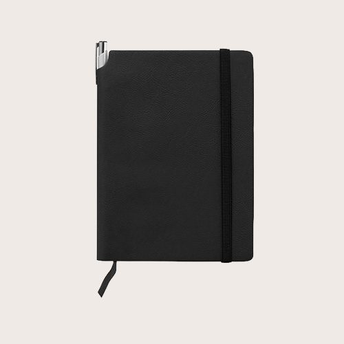 Cuaderno A5 con cubierta blanda de PU. Encuadernado en cartoné. 160 páginas de papel reciclado rayado (80 hojas). Cinta elástica de cierre y cinta marcapáginas a juego. Bolsillo interior expandible en la parte posterior. Portabolígrafos en el lomo.