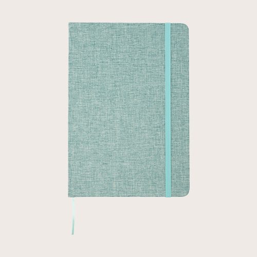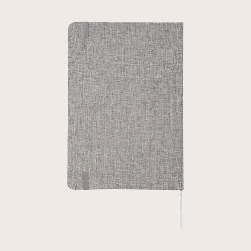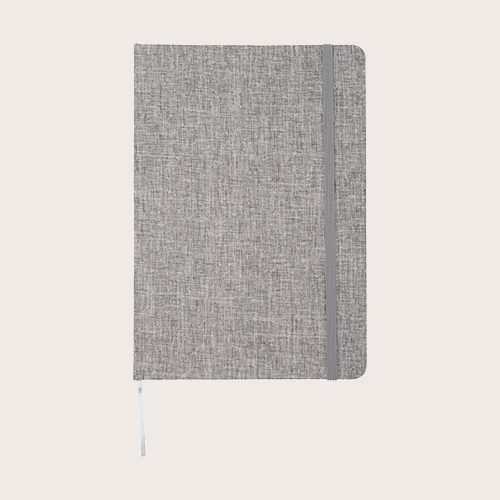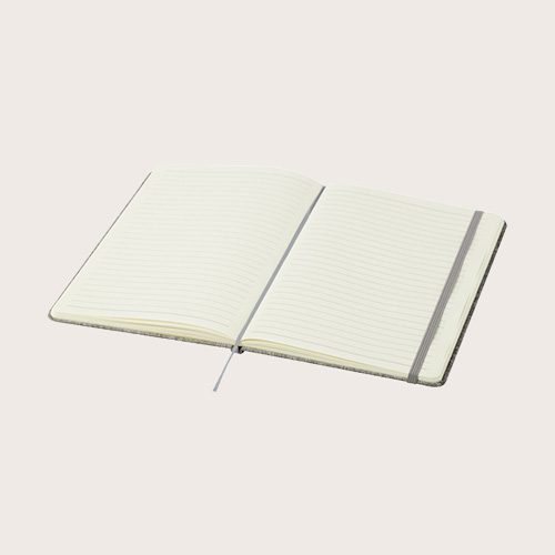 Libreta A5 de tapa dura de algodón reciclado con 80 hojas rayadas de papel de 70 g/m². La libreta tiene un cierre elástico, una cinta y esquinas redondeadas.