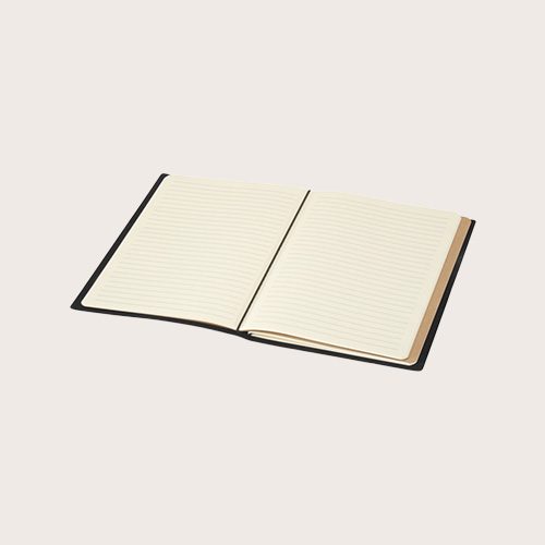 La libreta A5 rellenable tiene una cubierta de plástico reciclado con un cierre elástico que sujeta con seguridad dos cuadernos interiores, uno de puntos y otro de rayas. Cada cuaderno incluye 32 hojas de color crema fabricadas en papel de 70 g/m², con esquinas redondeadas y costura visible en el lomo para un aspecto artesanal. Las tapas de los cuadernos son de cartón. Los recambios están disponibles por separado en varios diseños, como punteado, planificador y rayado.
