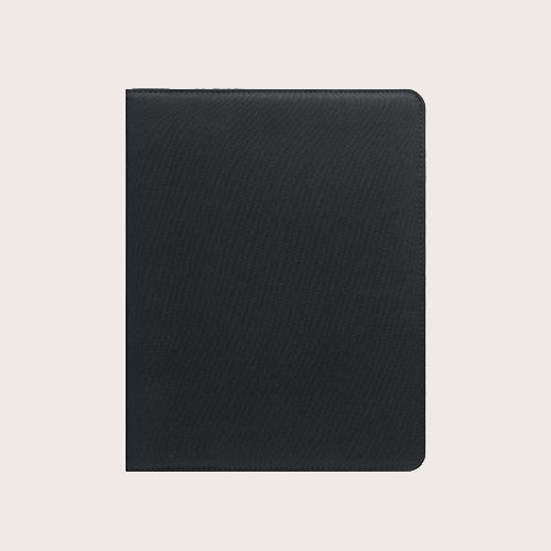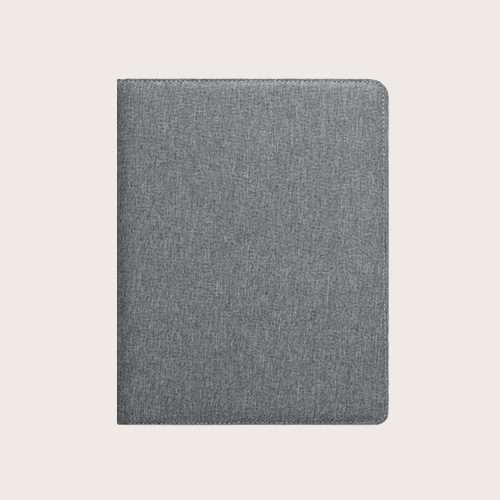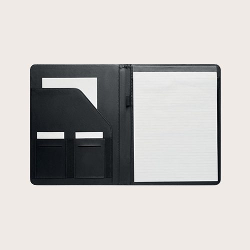 Porta documento jaspeado A4 de RPET 300D. Contiene compartimentos interiores y porta bolígrafo. Incluye un bloc de notas de 20 hojas rayadas.