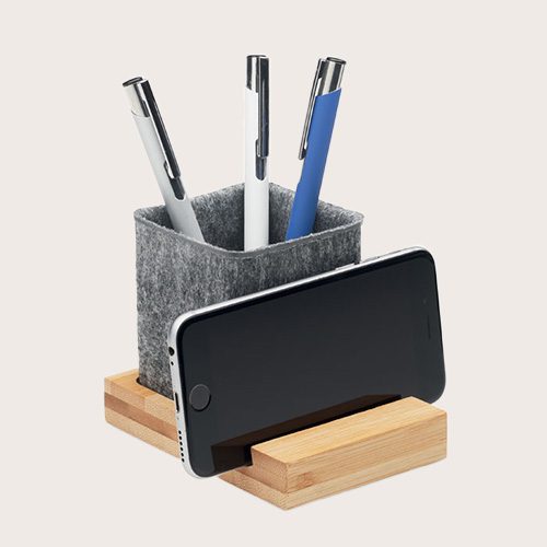 Portabolígrafos de fieltro RPET con base de bambú y soporte para teléfono.
