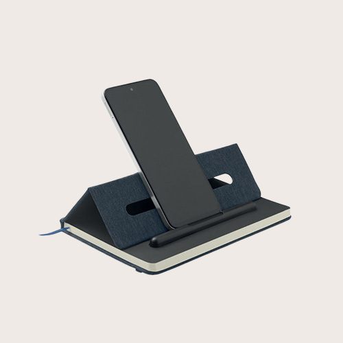 Libreta A5 con tapa dura de RPET con función de soporte para teléfono. Bolígrafo 2 en 1 integrado, normal y sin tinta, en ABS. 192 páginas rayadas de papel reciclado (96 hojas). Correa y marcapáginas a juego.