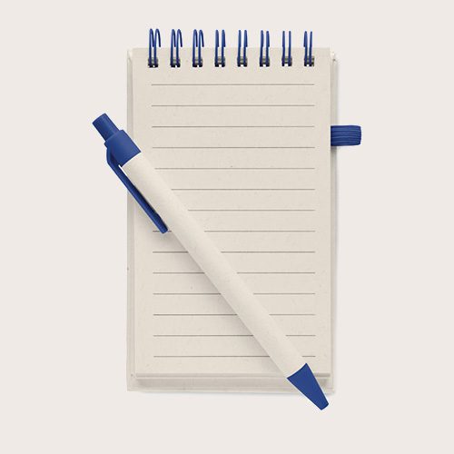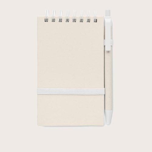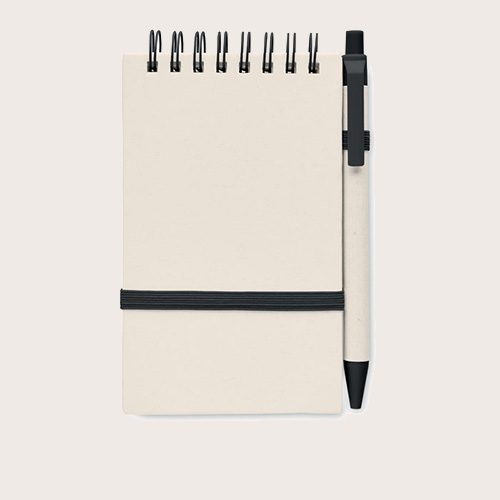 Libreta A6 de 70 hojas lisas (70% de cartón de leche reciclado y 30% de papel reciclado) con bolígrafo a juego. Encuadernado con espiral. Bolígrafo con pulsador a juego. Tinta azul. Banda elástica de cierre y portabolígrafos.