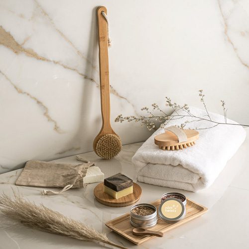 Cepillo de baño en bambú, con fibras naturales y cerdas de pelo de jabalí. Como el producto está fabricado con materiales naturales, el color como el resultado de la impresión pueden variar entre unos y otros productos.