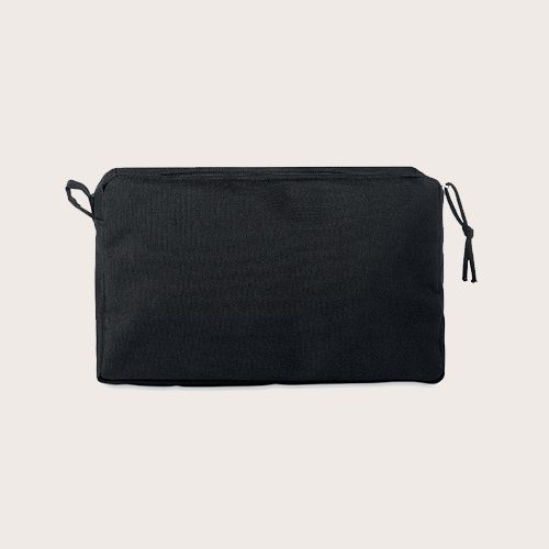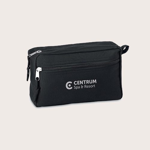 Este neceser con doble cremallera es perfecto para llevarlo de viaje. Puedes guardar todos tus cosméticos, botes de champú y maquillaje en el compartimento principal. El bolsillo delantero más pequeño se puede llenar con artículos más pequeños. El neceser está hecho de RPET 600D. Si el hotel o baño al que vas no tiene un lugar para ponerlo, puedes colgarlo del lazo del neceser.
