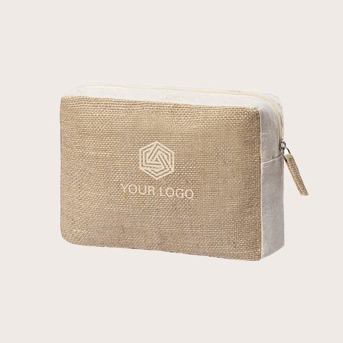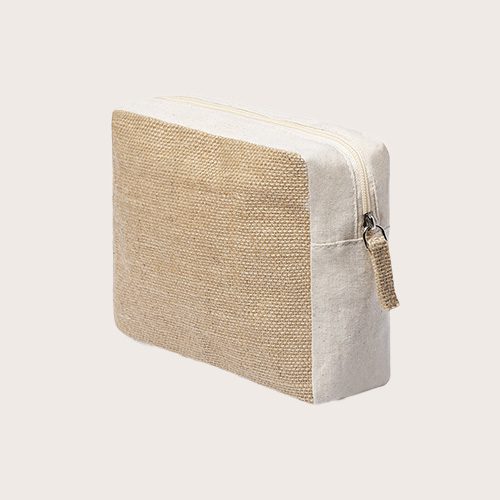 Neceser fabricado en combinación de yute laminado y algodón natural. Con cierre de cremallera y tirador en yute a juego.