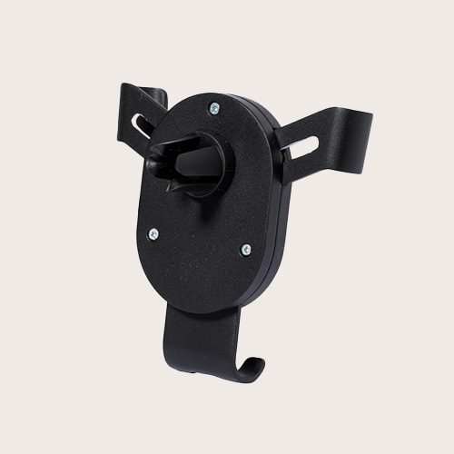 Ingenioso soporte para smartphone de diseño minimalista y especialmente diseñado para smartphones tamaño XXL. Elegante diseño negro con detalles en bambú, con sistema de fijación universal que se adapta por el propio peso del teléfono, ajustando las pinzas de agarre una vez que se sitúa el dispositivo en el soporte, con base rotatoria 360º. Para rejilla de ventilación del automóvil y con frontal especialmente diseñado para marcaje.