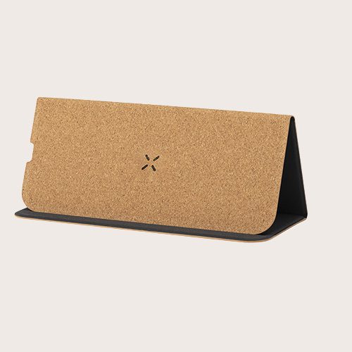 Alfombrilla de corcho natural. Con cargador inalámbrico integrado -cable Tipo C incluido-, base antideslizante y soporte para móvil integrado. Compatible con dispositivos equipados con tecnología de carga inalámbrica y presentada en atractiva caja de diseño eco.