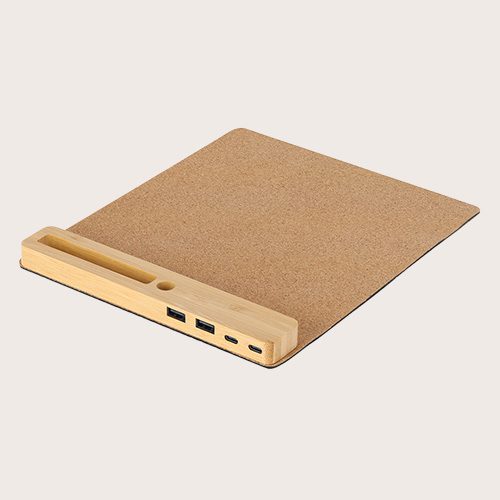 Alfombrilla multifunción fabricada en combinación de suave caucho y bambú. Flexible y con entrada Tipo C -cable incluido-, una salida Tipo C, y dos salidas USB; con función de sincronización de datos. Incluye soporte para smartphone y soporte para bolígrafos en la base de bambú. Es antideslizante y estable, garantizando una confortable experiencia de uso.