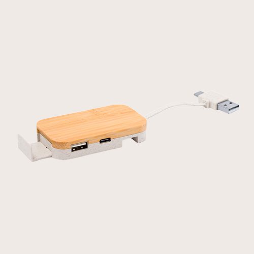 Puerto USB 2.0 con soporte para móvil extraíble integrado en la base. Parte superior del dispositivo fabricada en bambú, con base en caña de trigo.