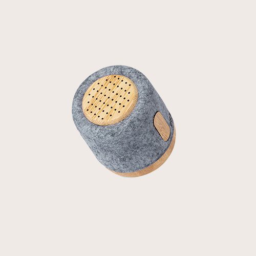 Altavoz con conexión Bluetooth®. Carcasa fabricada en bambú y fieltro RPET. Con 3W de potencia, batería de 300 mAh y conexión Bluetooth® 5.0. Incluye cable cargador Tipo C y manual de instrucciones en español e inglés. Con distintivo RPET y presentado en caja individual de diseño kraft.
