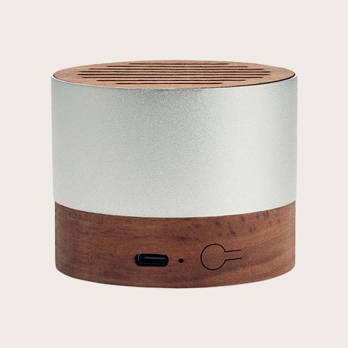 Altavoz inalámbrico 5.3 en carcasa de aluminio reciclado con base y detalle superior de nogal.